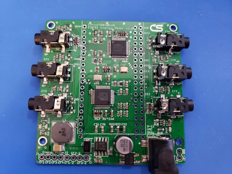 The ATM90E32 IC can measure up to three AC voltages although typically only one voltage measurement would be used for the mains electricity phase of a household. Three current measurements are read via CT clamps.